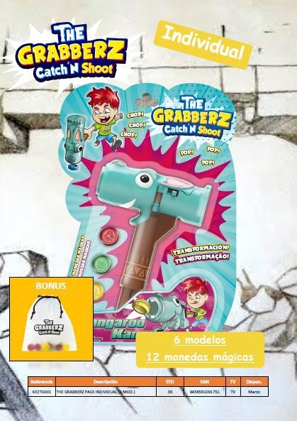 Vive por completo la experiencia de The grabberz. Contiene 12 monedas y portamonedas. Multijuego individual. 6 personajes transformables. Tira las monedas atrápalas transformación y dispara. Incluido juego de parejas y piedra papel tijera.